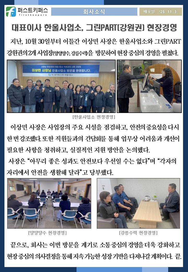 대표이사 한울사업소, 그린PART(강원권) 현장경영
